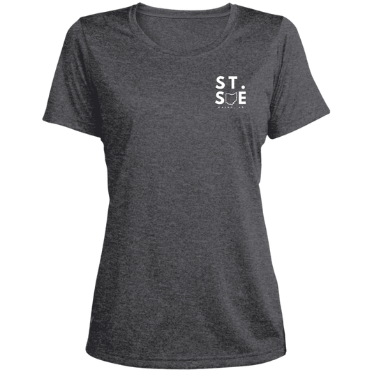 St. Sue Ohio Logo Ladies' Heather Scoop Neck Performance Tee
